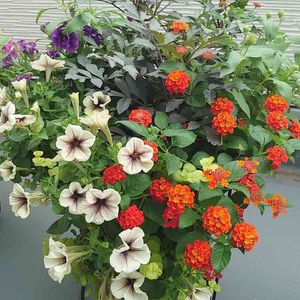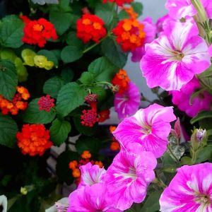 ランタナ七変化と、ペチュニア アロハ 隣の鉢だけどお互い引き立て合って映えている