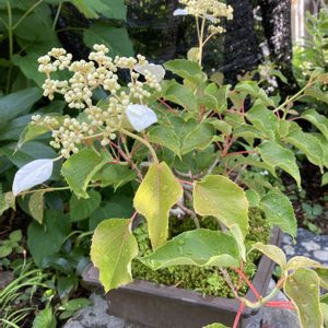 イワガラミを盆栽風にしようと頑張ってみましたところ、今年初めてお花が💕