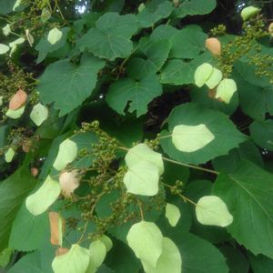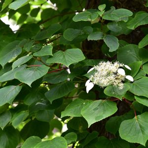 8/25 大木に絡みついて、かなり上の方まで這い上がってるこのつる性植物は、アジサイ科の「イワガラミ」ですね😍 📱なんで寄りきれないのですが、装飾花は一枚しかありません。 ややピンクがかって見えてるけど花の終わりに赤くなるのか、単に枯れてるのかはよく分かりません😅