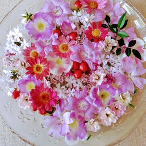 おはようございます😊 今年初めての花手水を作ってみました🎶 マーガレット、ヒペリカム、 ジャコウアオイ、ノコギリソウ サフィア→ももいろハート いちごシェーク ミニ八重咲きつるバラ 現在、開花中 なんだか、いまいち😉
