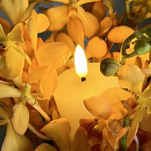 こんにちは♪ 定期検診で朝早く病院へ行きました (血液検査や尿検査などするので朝食は抜いて) まあまあ許容範囲の結果でしたので ホッとして街道沿いの ロイホでモーニング貪りました (朝が1番お腹空くので辛かったです😭) 帰りに買い物 オレンジの蘭が綺麗でしたので たくさん買って飾りました 部屋が薄暗かったので蝋燭灯してみました(電池式です) 灯が嬉しい曇りの午後