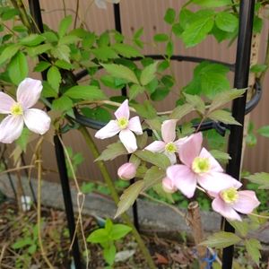 モンタナ系のクレマチス 咲き始めました🎵 緑の多い庭にやっと色が💦💦 この花は葉色もマットでステキですよね😍