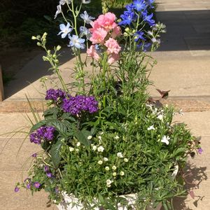 昨日 車で30分の園芸店の寄せ植え教室に参加して来ました🎶🎶🎶 先生に手直しして頂き とっても素敵な寄せ植えになりました🥰 デルフィニウム、キンギョソウ 、ヘリオトロープ、ロベリア、カリブラコア、バコパ、モンタナ、リシマキア、カレックエバーゴールド、アレナリア・モンタナ