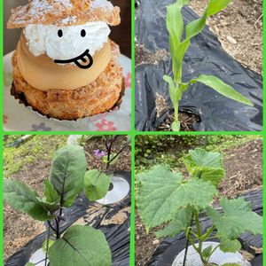 やっとこさ💦畑仕事完了♬ ナス〜きゅうり〜とうもろこし〜生姜〜アスパラ〜ピーマン〜パプリカ〜ミニトマト〜カボチャ〜オクラなど植えました♬ 次男が買ってきてくれた丸ごとプリンシューを食べて1日頑張れました♬😋