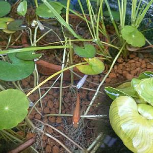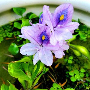 ホテイアオイの花💠🌿咲きました🎵😉 メダカさん🐟を飼い初めて10年位になりますが、ホテイアオイは買わなくても、毎年自然と増えてくれます🌿🌱 ここの睡蓮鉢は、ミックスメダカさん専用です🎶 覗くと👀餌が欲しくて、うじゃうじゃ寄ってきて可愛いです💕😍