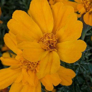 今朝の散歩の目的③ 最後は「マリーゴールド」 あいみょんの楽曲♪でも歌われた花ですね。 キク科マンジュギク属の一年草 和名では「千寿菊」「万寿菊」とも呼ばれますね。 やや花の数は減ってきたものの、健在ぶりが見られましたよ〜👋😁 1枚目は、一重咲きだと、まるで黄花コスモス⁉️なんて撮影しながら思いました〜