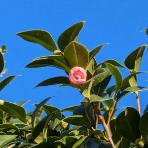 「二番花」 定点観察している乙女椿。 けっこう高い場所でブルーバックスタイルで姿を魅せてくれましたよ。