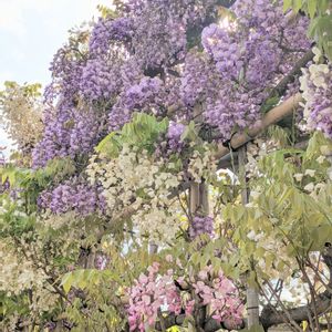 「3色の藤」 例年の最盛期には、奇麗な3段咲きの美しい姿…今年は😎? ⏬ ピンク株が弱っている様です(T_T)