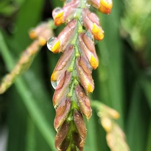 ヒメヒオウギズイセン ヒメヒオウギズイセン(姫檜扇水仙)はアヤメ科ヒオギスイセン属の雑種。ヒオウギズイセンとヒメトウショウブとの交配種である。園芸ではクロコスミアの名前でも呼ばれる。一般的に「ヒオウギズイセン」と呼ばれるワトソニア属の園芸品種群とは関係はないので、注意が必要である。また「金魚草」と呼ばれることもあるが、キンギョソウとは異なる。 wiki〜 朝撮り5:30 🏷木曜でも水滴 🏷そろそろ咲くよ。