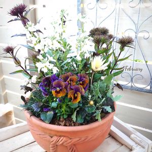 今日はアナーセンで開催中のパンジービオラ展に出かけました。 丁度人が少ない時間帯でゆっくり見て回ることが出来て幸せな時間でした❁ 年々参加される育種家さんが増えてる気がして来季はどんな子に出会えるのかとわくわくします😊 📷️は今日作った寄せ植えです✨ 絞りが可愛いエボルベ☺️