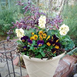 寄せ植えつくりました ①名脇役のアリッサムさんだけど たまには主役に。ほんのりピンク混じりのミックス株。 ②宮崎ビオラとアリッサム お互いに引き立て合う関係 ③ダークカラーのクローバーで引き締めて ④全体像、馴染んでくれるといいなぁ