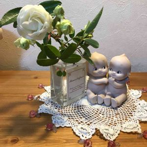 アンヌマリードモントラベルでエンジェル祭りに参加デス。 昨年より地植えにした薔薇、今年はもっと成長して欲しいナ 清楚な白薔薇さんにズッキューン💘💘💘 エンジェル👼は傘さしてたけど割れて取れちゃった〜、ま、いいね😊