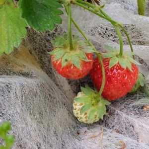 こんにちは~😆 ~イチゴ~です🍓 バラ園の🌹が満開の頃、 木の下には🍓が熟していました🎵 ナメクジ予防でしょうか? 不織布が敷いてあります💓 [ 4月末の pic ]