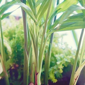 テーブルヤシ 百均の複数株植えから株分して単幹植えにした物です。 屋外の軒下で管理しています。