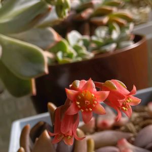 今 咲いている 🪴多肉のお花🪴 🪴紫麗殿🪴 パキフィツム属 お迎えしてから 毎年 可愛い赤い花が咲いてます💕 🪴熊童子🪴 コチレドン属 お名前とは違って お花は優しい色で…Ꙭ ‼
