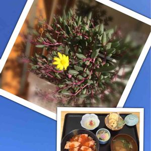 可愛い黄色のお花を咲かせたルビーネックレスさん、春にも花が咲きましたが、秋にも咲くんですね! 小さくて可愛い💕 そして今年二回目のはらこ飯です😆 天ぷらと茶碗蒸し付き😍 backのブルーは雲一つない青空を撮影したものです🤗 青い空と海沿いの風が爽やかで気持ちの良い1日でした😊