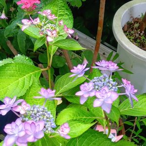 山紫陽花 鉢植えで3輪 咲いてきました。 モナルダとコラボに なってます😅