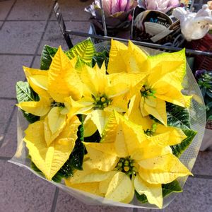 おはようございます😊 ①昨夜、ずっと水にも浸けず置いていたヒロム杉でリーフ作りました💞なぜ水に浸けてなかったのか🤣 ②昨日の夕方、寄植えしました🧺 先日作った葉ボタンリースと一緒に🫶 カゴ🧺に葉ボタンが入りきれず減らしたりさましたが、まだギュウギュウ😂 ③お迎えした黄色のポインセチア💛✨ ④フリル咲きパンジー スリールドランジュとポリゴナムとアリッサムの寄植え パンジーがよく咲いてくれています🩵💜 ⑤ニット帽を被っている小鳥ちゃん🐦️ 一目惚れちゃん😍