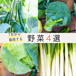 7月から始める家庭菜園🌱 今回は、7月から育てることができる野菜の種・苗のご紹介をします♪ この時期に栽培できる野菜は(成長が早いキュウリを除いて)秋~冬から収穫できるものが中心です。 土壌のpH調整に時間がかかることもありますので、事前準備はお早めに⌚ ご自身のライフスタイルに合わせて選んでみてくださいね。 ✧✧✧✧✧✧✧✧✧✧✧✧✧✧✧✧✧✧✧✧ 7月から始める野菜栽培4選! ~葉菜類~ (種まき)キャベツ (種まき)ブロッコリー (植え付け)白ネギ ~果菜類~ (植え付け)キュウリ 💡栽培のポイントは「野菜の育て方」へ! https://shizengurashi.jp/blogs/method 💡栽培カレンダーを季節ごと・野菜ごとに見るなら「野菜栽培カレンダー」へ! https://shizengurashi.jp/pages/calendar 🌟自然暮らしLINE公式アカウントのリッチメニューからも調べられます♪ お友だち追加で、公式サイトで使えるクーポンを配布中です。ぜひご活用ください! https://lin.ee/acXVIss/?openExternalBrowser=1