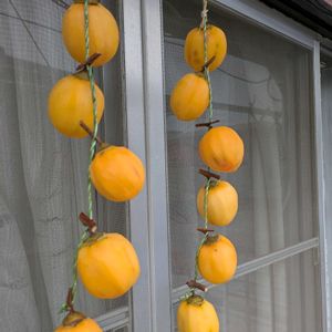 庭の一角で干し柿 今年はYouTubeで見た、熱湯+焼酎の消毒を試してみました 一番黒くならない方法だそうです どうなるか楽しみ