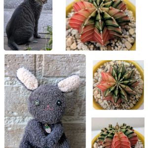 まつぴよさんの、グレーのうさぎちゃん 可愛い🐰 室内に置きっぱなしの🌵ギムノカリキウム ↖朝と夕方にご飯を食べに来る、海くん(カイくん)🐱 ある程度は近くに寄れるけど、毎日「シャーッ」って言われます😂