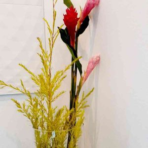 オミナエシ が、咲きましたぁ🌼 ☆ オミナエシ ☆ ツルバキア ☆ セイヨウノコギリソウ ( 白 ) ☆ フランネルソウ ☆ ティー ツリー 🌿 ( 添えの 葉っぱ ) です。 また 今日、うちの子に なった この子を 添えて..... 😁💕