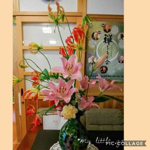 🌿こんばんは~。 本日小雨の中☔お墓参りに行ってきました😄 菩提寺の入口に飾られていたお花です🌸