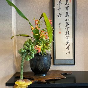 お出かけ先の玄関に 見事なお花が生けてありました😍 グロリオサの華やかさと バナナの花?! 実にダイナミックな生け方で、 しばし見惚れました💖 重たげな黄色の花は良くみると とても精巧で、、 絶妙なバランス❣️ 生けた方とお話ししたかったです💛