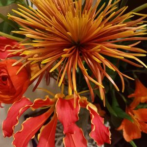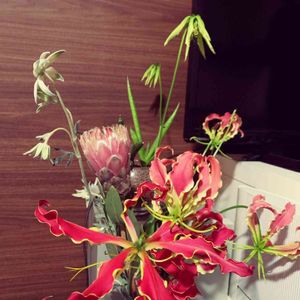おはようございます☔️ 雨☔️風🌬🌀ともに強い朝です。 「今日のお花」グロリオサ 流石に高級なお花は無いかなと思ったら、ありました‼️ お誕生日🎂のお祝い🎉にいただいた花束💐です。 iPhone📱の写真の検索機能にお花がある事、今頃知った😅🤣
