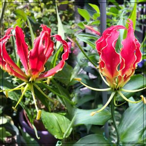 調子に乗って⤴️😚 今日のお花─ グロリオサの大放出‼️ 別名─ツルユリ(蔓百合) ユリグルマ(百合車) キツネユリ(狐百合) 花言葉…燃える情熱 咲き始めをコラージュでご紹介します😌