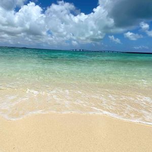 守り神 宮古島のパワー 2 はるか右手に伊良部大橋 左手に島のグリーンが望めます。 平坦な島の特徴🏝からなのか 見渡せる水平線 身近にない広がる空 そしていつも遊んでいる雲 このビーチも人影は無いのに 海と空と雲が 私を呼び止めてくれました。 そうそう 何時も元気でいてね٩(๑❛ᴗ❛๑)۶ と言われました。 アナタモゲンキデイテクダサイ🐬🏝