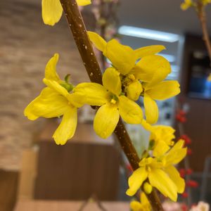 今日のお花 レンギョウ 1️⃣2️⃣先日雨の日に 3️⃣まだ蕾が多い頃のレンギョウ 4️⃣5️⃣雲南黄梅 西の窓辺で咲いてます♪ 黄梅より花が大きいです🌼🌼