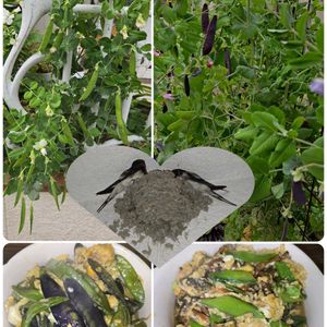 えんどう達が育ってきて、少しづつ食べ始めました(∩゚∀`∩) えんどう豆が膨らんだらグリンピースご飯に挑戦だーd=(^o^)=b 2食絹さやの卵とじと、つくしとさやえんどうの卵とじにしました(〃´ー`人´ー`〃) アントシアニンの濃い紫の煮汁を卵で綴じで逃がさずパクパク(((o(*゚∀゚*)o))) つばめさんが今年も住んでくれました(*´σー`)エヘヘ