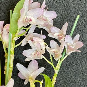 Den. Sun Fairy ‘Mikochan’ 小型の交配種 一昨年のバレンタインにいただいた花です。 花;3x3cm 草丈;18cm 白色にほんのりピンク色がかかった、清楚で可憐な花が咲き進んでいます。 今年は少し遅れているようです。