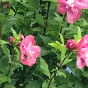 ずっと☔️降りで、せっかくたくさん咲いていたムクゲが… ドンドン落ちる😭 ベタ〜っとなるので落ちる前の花殻を摘んでたら… ブーン🐝と… ヤバッ💦最近毎日うろついているスズメバチ😱💦 かなり離れて撮ったのを拡大したのでボワ〜っとしてますが… スズメバチですよね? 花の蜜を吸うの?