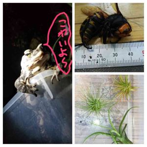 5月としては、異例の暑さですね。 今日は、エアプランツの水浴びをしました。 窓辺で暑そうだったので… 色つやよく、元気になりました❗ スズメバチが出現❗ 旦那が叩いて退治😬 カエルが木の根元に現れて一言、 「こわいよ~ ((( ;゚Д゚))) 」 息子の写真を拝借😅