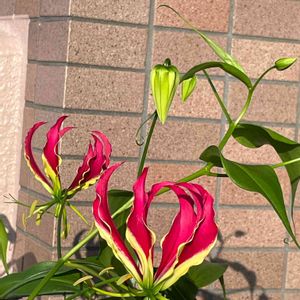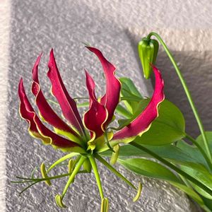 グロリオサ、2度目の開花です。 去年は地植えで球根を虫に食べられて花が咲かなかったので、今年はプランターにしてみました。 青空に映えますね。ものすごく暑いけど😵💦
