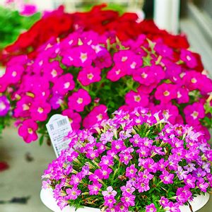 ペチュニア達が絶好調です🌈 手前から サフィニアプチさくらもこもこ サフィニアアート小梅ちゃん ノーブランドペチュニア です。 梅雨ですが、元気いっぱいです。 🏷花と生きるサントリー