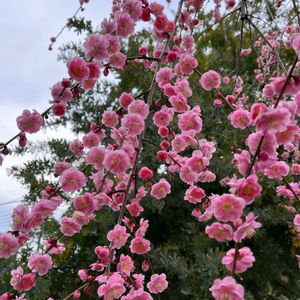 ①②③④豊後梅 バラ科 (ぶんごうめ)寺院のお庭 野梅とアンズの自然交雑種 ❣️枝がやや赤みを帯びる ⑤枝垂れ梅🌸満開 (近所のアイス🍨屋さん)