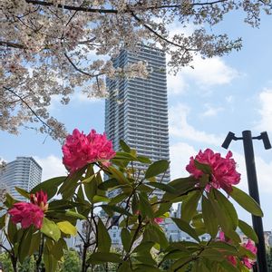 シャクナゲ …桜🌸 2023.4.1撮影 鮮やかなシャクナゲが桜の木の下で気持ち良さそうに咲いています。 この日は暖かい一日でした。