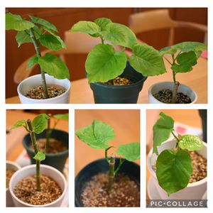 4/25にカットした ウンベラータ。大きい鉢に植え替える前にパチリ📸 水をやり過ぎてしまうから、スリット鉢で挿し木!はじめてやってみた。棒からここまでになるとは!