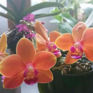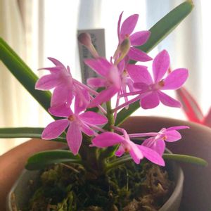 2018年6月26日に『たぶんバンダ プチブーケ(Vanda Petit Bouquet)』として投稿したのと同じものです。 昨年は6月25日が初花でした。一房咲き終わると次々と花軸が上がってきて、8月の中旬まで咲いていました。 よく似た花に バンダ チェリーブロッサム(Vanda Cherry Blossom)というのがあって、ネットで見比べるととても分かりにくいのですが、 チェリーブロッサムはセッコク(Vanda falcata)とバンダ アンプラセア(Vanda ampullacea)を交配したもの、 プチブーケはチェリーブロッサムにアンプラセアをかけ戻したもので、プチブーケの方が葉も花も少し厳つい感じになります。 一昨年も書きましたが、うちのは『セッコクの交配種で、セッコクほどじゃないけど寒さにも強いよ』とだけ言われて買ってきたので、ラベルもなにもなかったのですが、チェリーブロッサムと見比べる度に(うちのはゴツいな)と感じます。