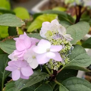 山アジサイ うちに来て何年目だろう? いつもひっそりと咲いている。奥ゆかしい~💕 色が渋めで私好み😊 ラベルがどっかへ飛んでしまい名前がわからず…