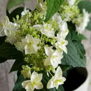 山アジサイ 八重白扇💚 我が家の山アジサイ白扇、去年の夏の暑さにやられて枯れてしまったので、ホムセンで偶然にも見つけお連れしてしまった😆 …この色の感じがやっぱり好きでついつい手がでてしまう😄
