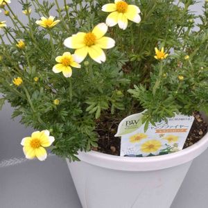 多年草育ててみようチャレンジでPWのビデンスキャンプファイヤー「レモンシロップ」をお迎えしています。つぼみがたくさんついていて、1週間で西向きの環境でも次々開花しています。 蛍光っぽく発色の良い黄色と白のツートーンでベランダが明るくなりました。耐寒性は0℃とのことでもう少し気温が下がったら夜マーガレットと取り込むかなあ。