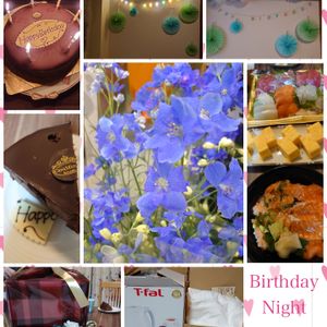 3/28㈫① 一応大好きなデルフィニウムが主役です。出先のお花屋さんのデルフィニウムです🤭💙💙💙 昨日のサプライズは、まずケーキ。 お洒落なザッハトルテ🥧は息子が娘宅に送ってくれました。 娘が1番好きなケーキ!私も久々に大人のチョコレートケーキを堪能しました!! 孫は「コレは🍇?🍓?がチョコレートにはいってるの?アプリコットって?アンズ??う〜ん、大人のチョコレートケーキ🥧なんだね。ユウ君大人になったら食べるわ」😂 部屋のディスプレイをしてくれていたの全然知りませんでした!隣の部屋で👶ハル君に🍼あげていたので… 水色の紙の丸いのや、風船は100均で調達したそうですが、HAPPY BIRTHDAYの文字も光るのには驚きました😯そうそう娘はこういう飾り付け得意でした!! 夜と朝の写真です。 後でハル君を連れて行ってソファに寝かせて電飾を点けたら目が真ん丸になりました😂 この飾りの下でユウ君がHappybirthdayの歌を何回も歌ってくれました。今朝お礼を言ったらまた歌ってくれました🎶 夕飯は磯丸水産の海鮮丼を娘の旦那さんがTAKEOUTして、ロピアのお刺身盛り合わせを並べたもの。手抜きして美味しく頂きました😋 プレゼントに白いオーガニックコットンのワンピースを貰いました♡♡♡白は自分では買わないでしょ?って…うん買わない。でも目立つよねー恥ずかしいわ😆上に柄物重ねよう。白い靴欲しいわ。 T-FALは、ベビーシッターのお礼だそうです。うちのがちょうど買い替えようと話してると言ったのを覚えていてくれました。 色々皆で用意してくれて嬉しかったです。素敵な誕生日になりました😄