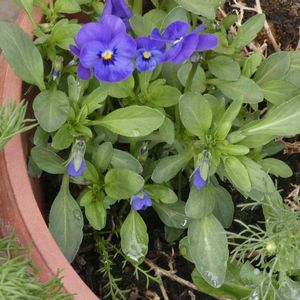「咲き始めのお花たち」No.277 〜ビオラ〜 こぼれダネから芽吹いたビオラさん。 ほら、3つ咲き始めています。 (祝)チーム・ブルー3周年 🏷咲き始めのお花たち 🏷春色の青い花2023