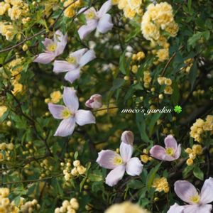 パーゴラの上の方を望遠レンズを使って📸パチリ モッコウバラとクレマチス「モンタナ・エリザベス」が咲き始めましたよ〜🌸 ここにはアーマンディを這わすつもりだったのにエリザベスが知らないうちに…😅 まぁ、いっか(笑)