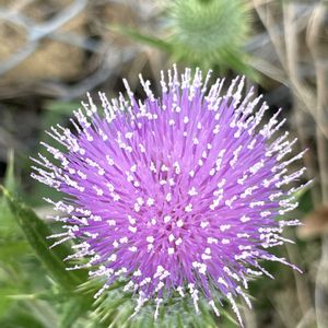 今日のお花💠アザミ 線路脇のアザミ💜シベの先にいっぱいの 白い花粉を付けてます💜🤍 今年も見られませんでした😞 花後の綿毛も可愛い😍 2023.5月/7月撮影