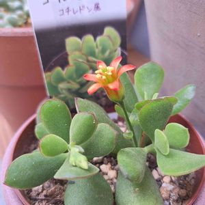此方は花かんざしさんとしてお迎えした コチレドン(コチドレン)・パピラリス(ゴルビューとも)さん😻💚🧡❤️ タコウィンと唐辛子と空豆🐙🌶️🫛